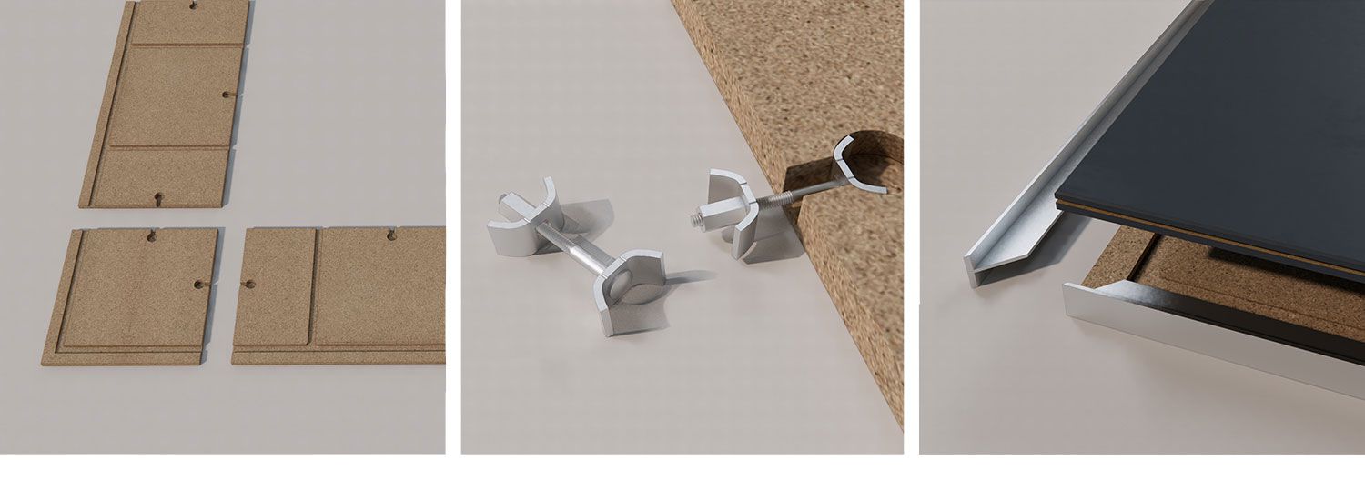 La struttura della pedana Wood è una evoluzione sapiente delle comuni pedane con sottofondo in truciolare. Si compone di un abaco di 4 quadrotte base delle dimensioni di 100x200 cm (centrale), 100x50 cm (di bordo), 200x50 cm (di bordo) e 50x50 cm (angolare), realizzate in legno truciolare ignifugo e caratterizzate dalla presenza di un reticolo fresato per l’alloggiamento dell’impianto elettrico; ogni quadrotta è dotata di particolari perni di fissaggio che permette la connessione con la quadrotta adiacente. Lo spessore complessivo della struttura è di 2.2 cm.